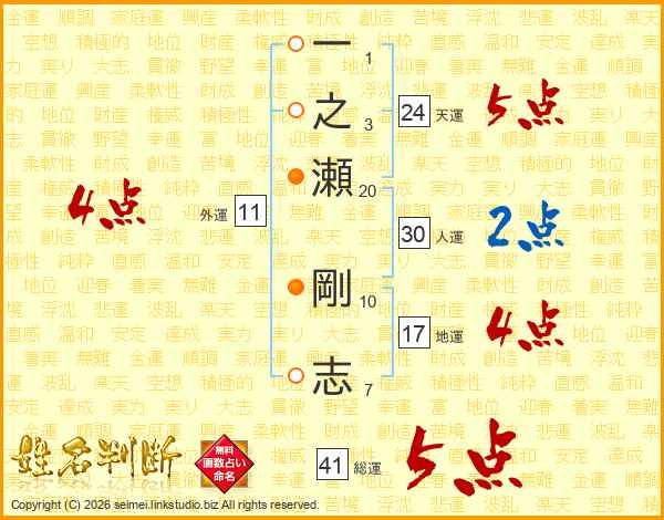 一(1画)之(3画)瀬(20画) 剛(10画)志(7画)