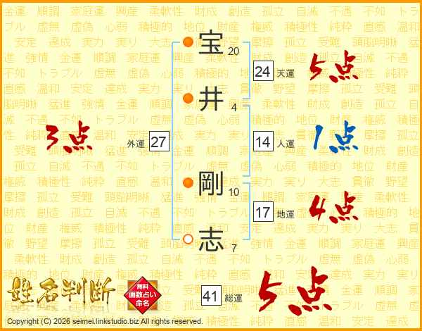 宝(20画)井(4画) 剛(10画)志(7画)