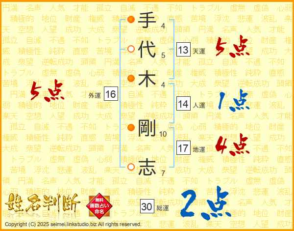 手(4画)代(5画)木(4画) 剛(10画)志(7画)