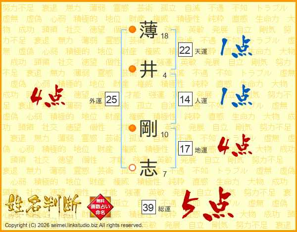 薄(18画)井(4画) 剛(10画)志(7画)