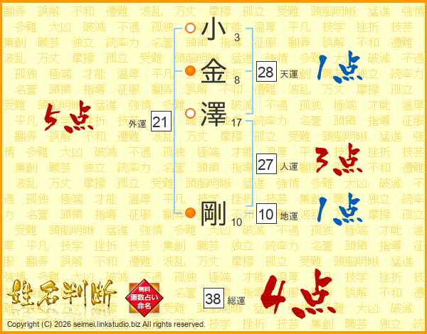 生活面を象徴する運勢です。外部から受ける影響力を表し、結婚運、家庭運や職場、環境への順応性を表します。総運から人運を引いた画数。姓や名が1文字の場合を除く。