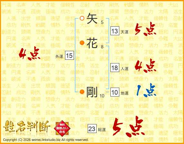 あなたの人生を表す1番重要な運勢です。生涯を通じて影響する総合運となり、主に50歳以降の晩年期に影響を及ぼします。苗字と名前の合計画数。