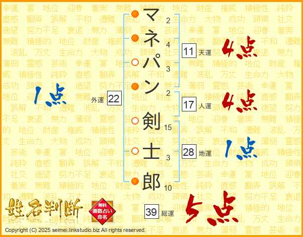 マ(2画)ネ(4画)パ(3画)ン(2画) 剣(15画)士(3画)郎(10画)