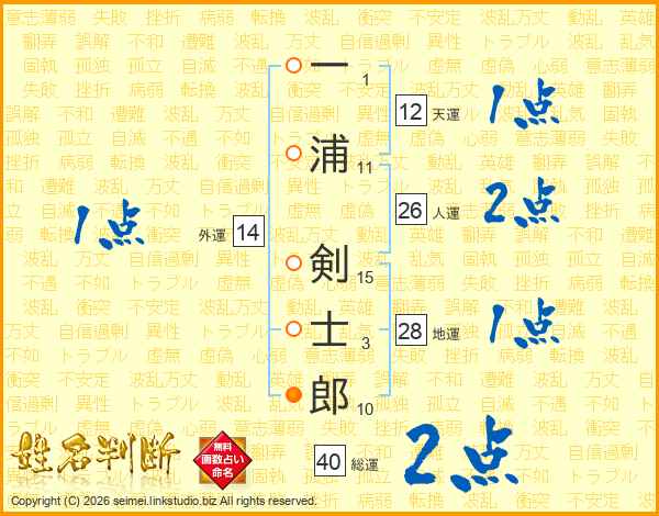一浦剣士郎さんの人運は26画の2点!