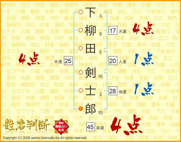 下柳田剣士郎さんの総運は45画の4点!