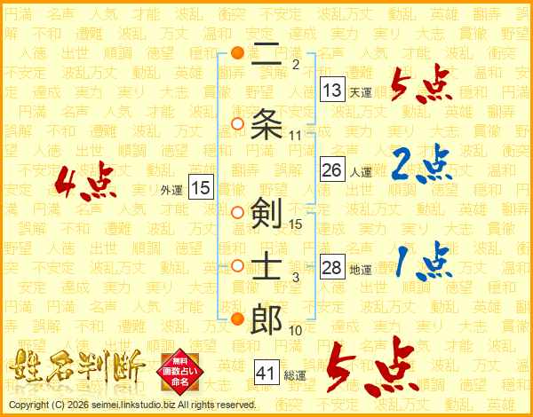 二(2画)条(11画) 剣(15画)士(3画)郎(10画)