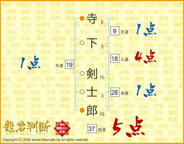 寺(6画)下(3画) 剣(15画)士(3画)郎(10画)