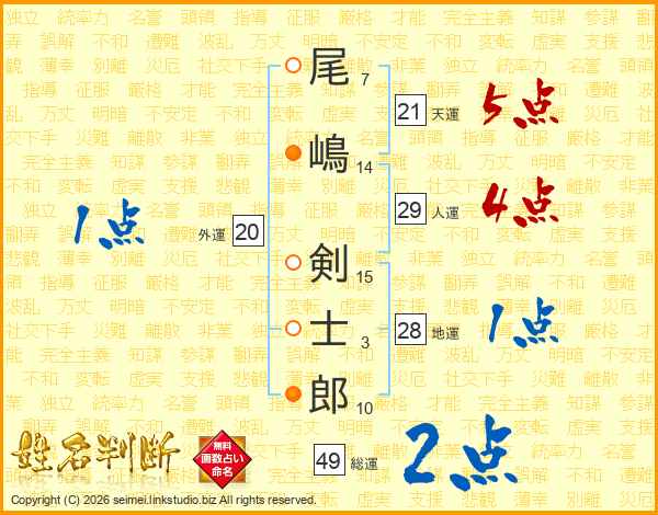 尾(7画)嶋(14画) 剣(15画)士(3画)郎(10画)