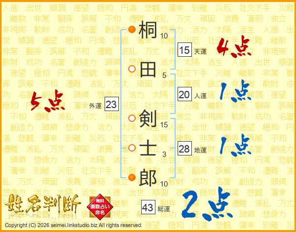 桐(10画)田(5画) 剣(15画)士(3画)郎(10画)