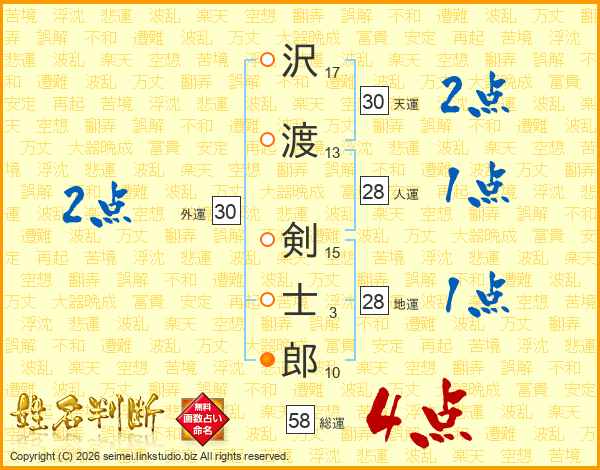 沢(17画)渡(13画) 剣(15画)士(3画)郎(10画)