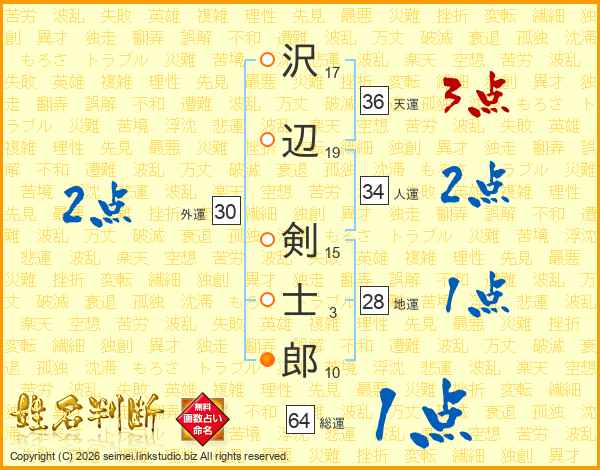 沢(17画)辺(19画) 剣(15画)士(3画)郎(10画)