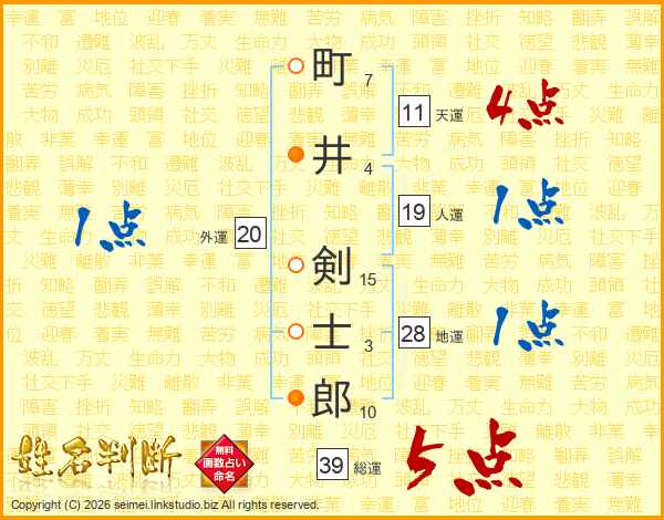 町井剣士郎さんの総運は39画の5点!