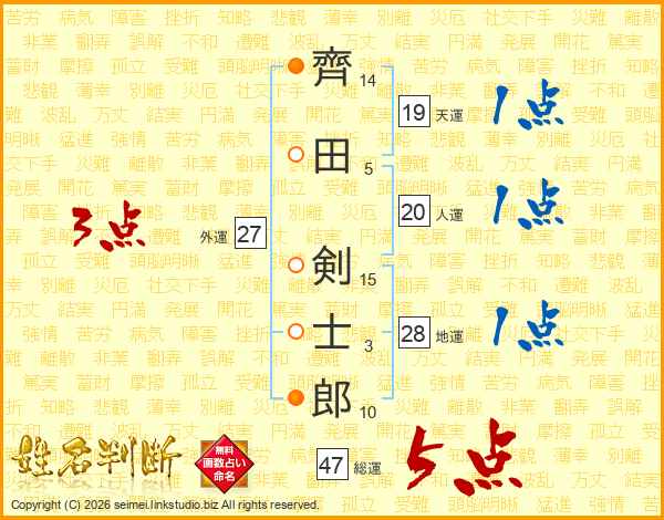 齊(14画)田(5画) 剣(15画)士(3画)郎(10画)
