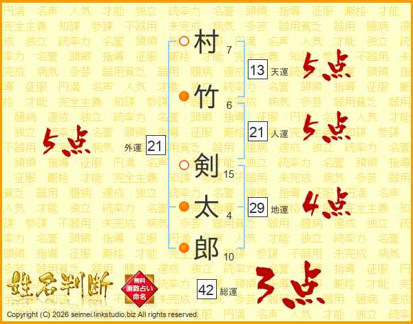 村(7画)竹(6画) 剣(15画)太(4画)郎(10画)