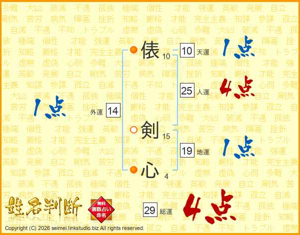 生活面を象徴する運勢です。外部から受ける影響力を表し、結婚運、家庭運や職場、環境への順応性を表します。総運から人運を引いた画数。姓や名が1文字の場合を除く。