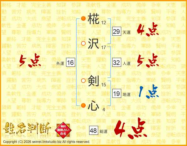 椛沢剣心さんの外運は16画の5点!