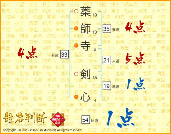 薬(19画)師(10画)寺(6画) 剣(15画)心(4画)