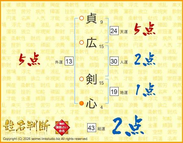貞広剣心さんの総運は43画の2点!