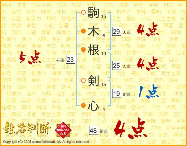 駒(15画)木(4画)根(10画) 剣(15画)心(4画)