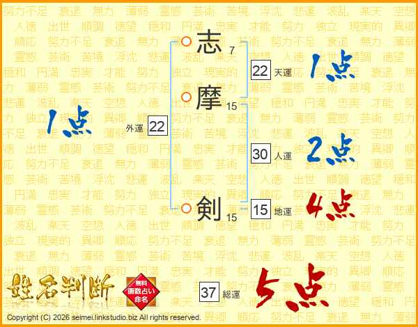 あなたの人生を表す1番重要な運勢です。生涯を通じて影響する総合運となり、主に50歳以降の晩年期に影響を及ぼします。苗字と名前の合計画数。