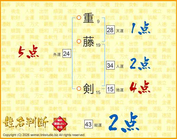重藤剣さんの総運は43画の2点!