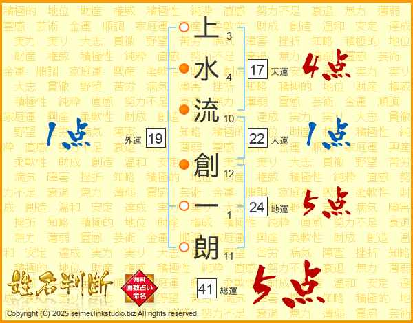 上(3画)水(4画)流(10画) 創(12画)一(1画)朗(11画)
