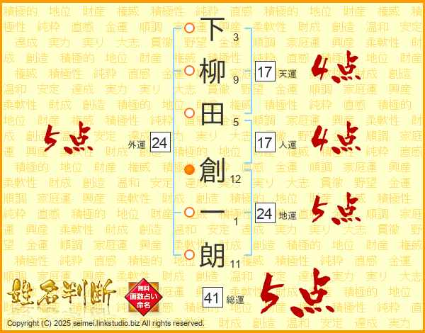 下(3画)柳(9画)田(5画) 創(12画)一(1画)朗(11画)