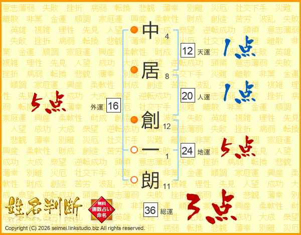 中(4画)居(8画) 創(12画)一(1画)朗(11画)