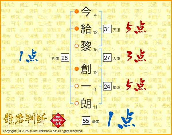 今(4画)給(12画)黎(15画) 創(12画)一(1画)朗(11画)
