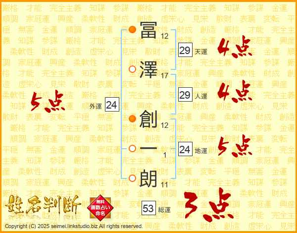冨(12画)澤(17画) 創(12画)一(1画)朗(11画)