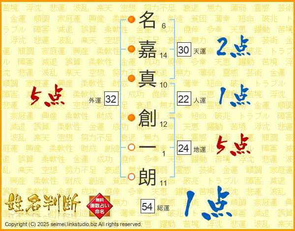 名(6画)嘉(14画)真(10画) 創(12画)一(1画)朗(11画)