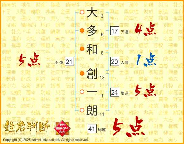 大(3画)多(6画)和(8画) 創(12画)一(1画)朗(11画)