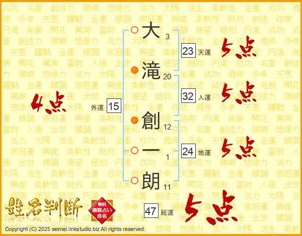 大(3画)滝(20画) 創(12画)一(1画)朗(11画)