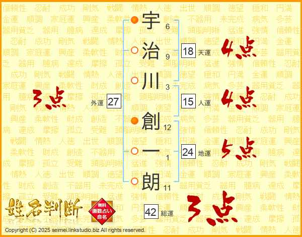 宇(6画)治(9画)川(3画) 創(12画)一(1画)朗(11画)