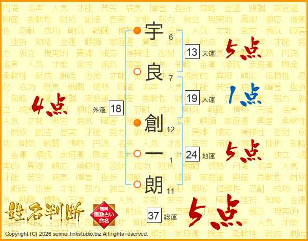 宇(6画)良(7画) 創(12画)一(1画)朗(11画)