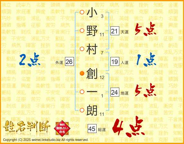 小野村創一朗さんの総運は45画の4点!