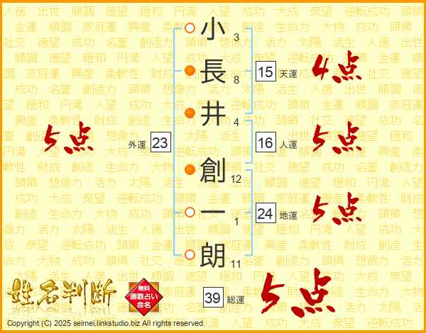 小(3画)長(8画)井(4画) 創(12画)一(1画)朗(11画)