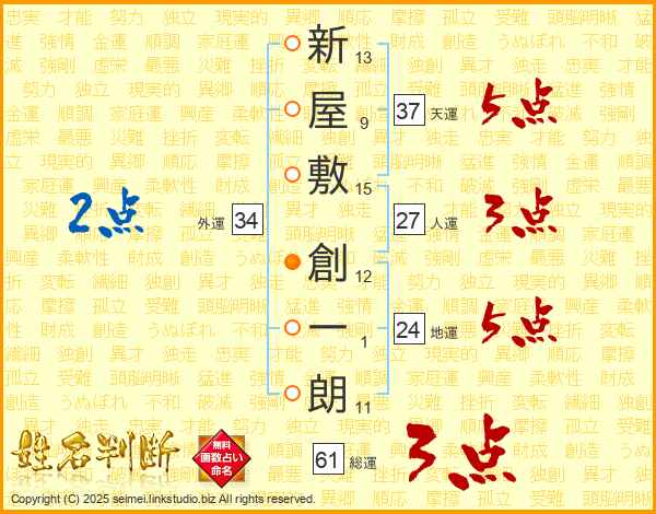 新(13画)屋(9画)敷(15画) 創(12画)一(1画)朗(11画)