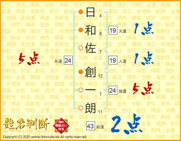 日(4画)和(8画)佐(7画) 創(12画)一(1画)朗(11画)