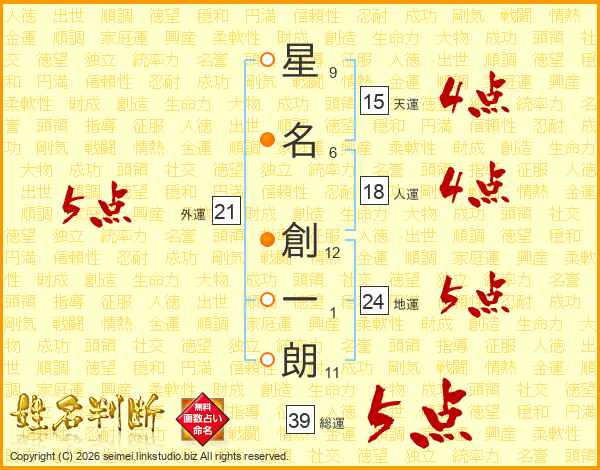 星(9画)名(6画) 創(12画)一(1画)朗(11画)