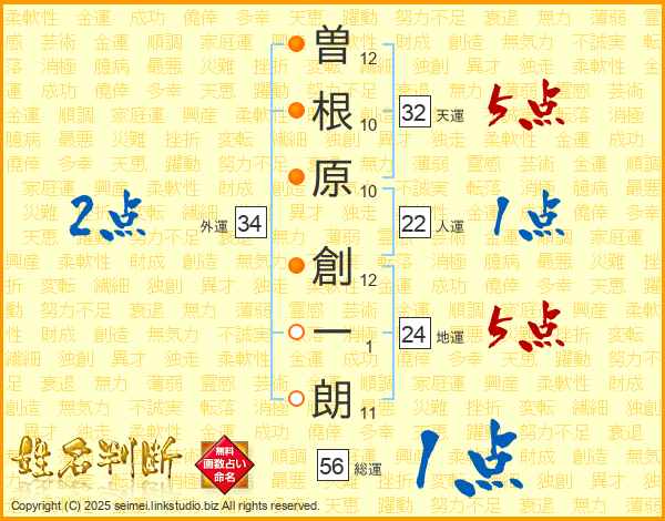 曽(12画)根(10画)原(10画) 創(12画)一(1画)朗(11画)