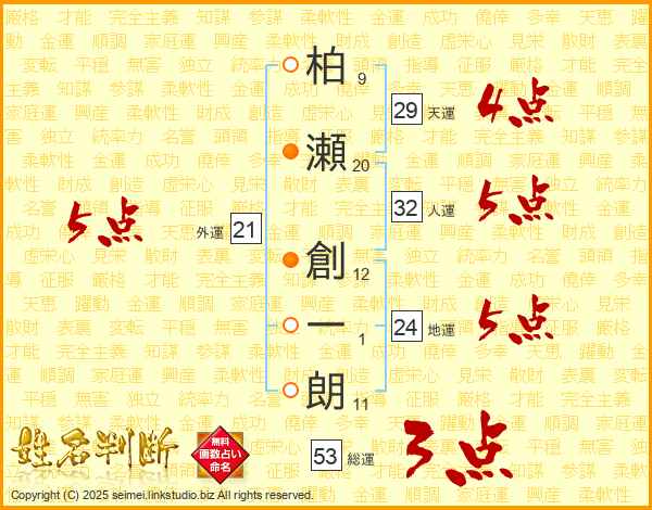 柏(9画)瀬(20画) 創(12画)一(1画)朗(11画)