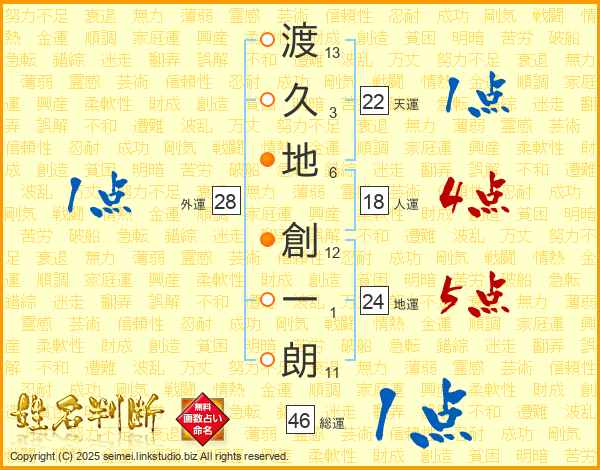 渡(13画)久(3画)地(6画) 創(12画)一(1画)朗(11画)