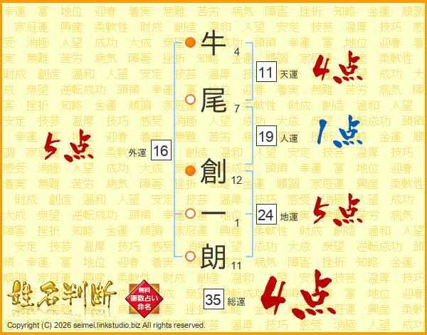 牛(4画)尾(7画) 創(12画)一(1画)朗(11画)