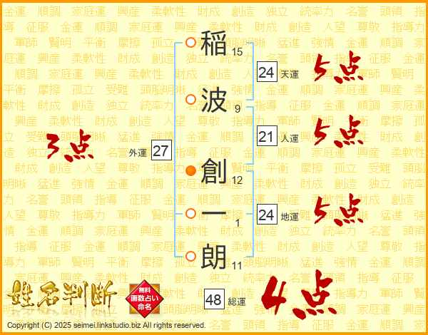 稲(15画)波(9画) 創(12画)一(1画)朗(11画)