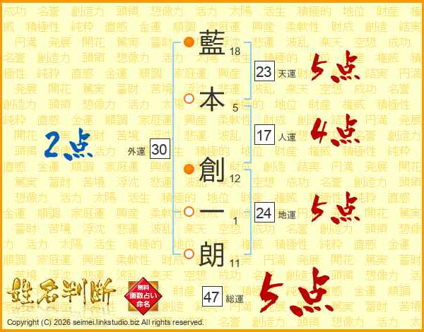 藍(18画)本(5画) 創(12画)一(1画)朗(11画)