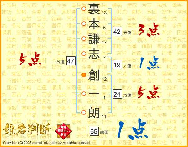 裏(13画)本(5画)謙(17画)志(7画) 創(12画)一(1画)朗(11画)