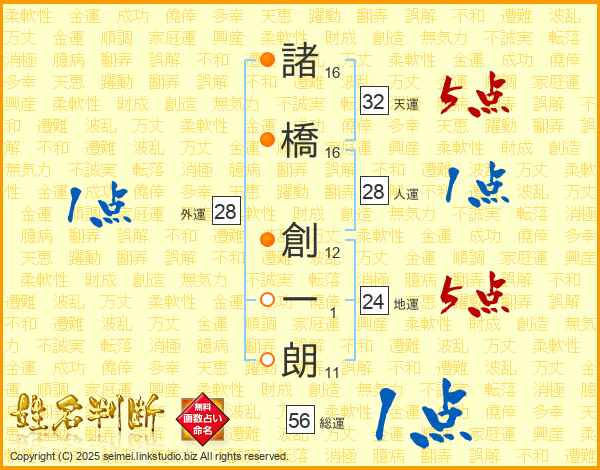 諸(16画)橋(16画) 創(12画)一(1画)朗(11画)
