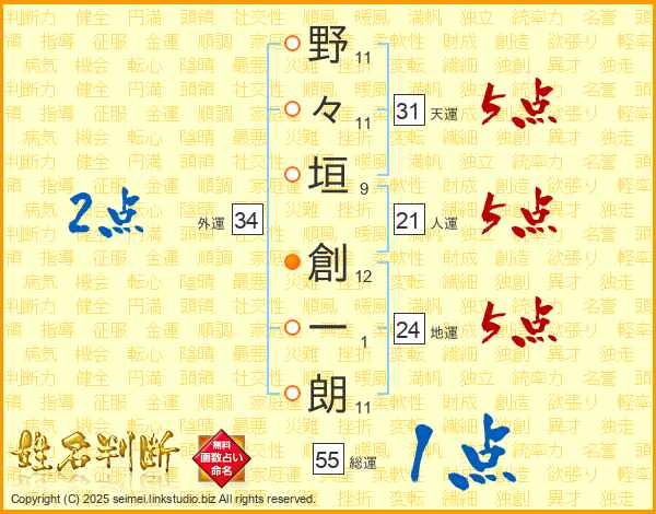 野(11画)々(11画)垣(9画) 創(12画)一(1画)朗(11画)