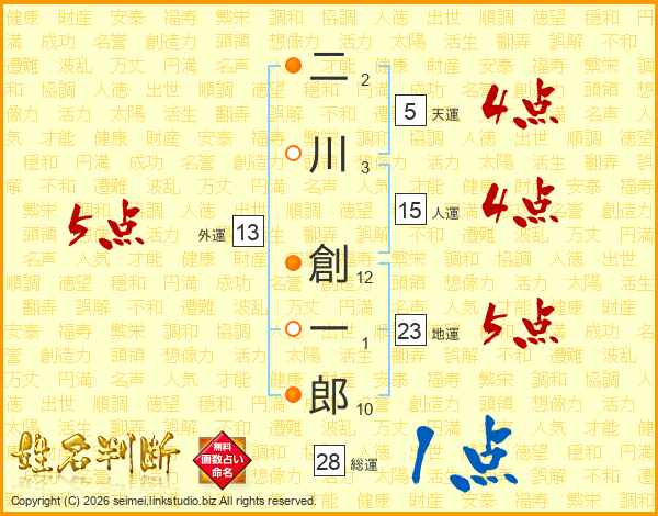 二(2画)川(3画) 創(12画)一(1画)郎(10画)